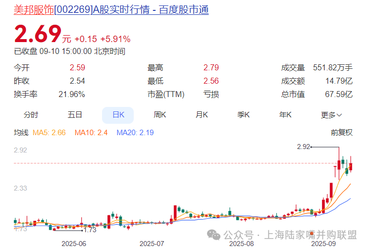 资本市场上,美邦服饰股价近期波动较大。9月以来,美邦服饰一度连涨5天,其中还走出2连板,不过本周却连续2天下跌。9月10日,美邦服饰股价大涨5.91%,报收2.69元。截至9月10日收盘,美邦服饰股价月内涨幅达34%。