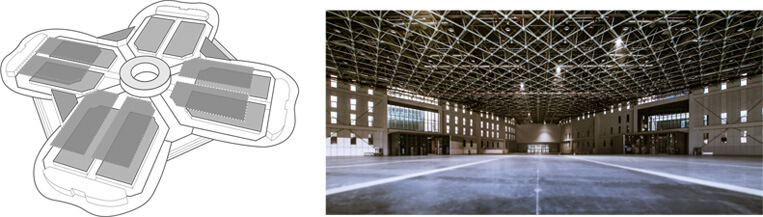 国家会展中心的1至3号馆均为单层无柱展厅,长度270米,穹顶跨度108米,净高32米。4至8号馆为双层大展厅,其中一层展厅净高12米,柱网27x36米;二层展厅净高17米,柱网54x36米,整个展厅仅有8根立柱。无以伦比的展示空间,为展商形象的高品质呈现提供了无限的可能性。
