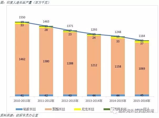 在过去五年里,印度的长丝产量按复合年增长率6%的速度递减。聚酯长丝产量占人造长丝总产量大约93%。
