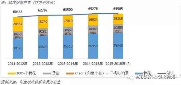 在过去五年里,印度的织物产量按复合年增长率2%的速度递增。棉织物占多数,为59%;而人造织物和混纺织物分别占23%和17%。