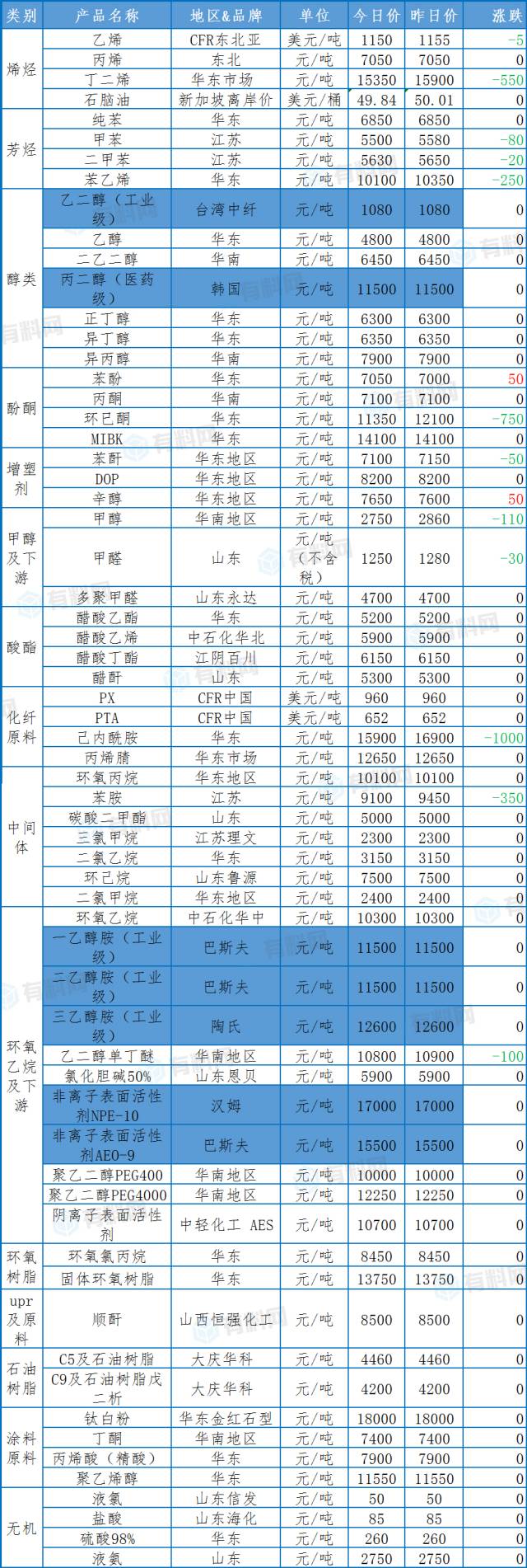 * 蓝色底色为有料网价格,红色为涨幅,绿色为跌幅