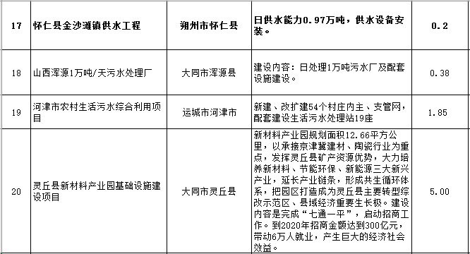 近日,山西省发改委发布2017年第一批传统基础设施领域PPP项目推介名单。此次推介发布PPP项目95个,总投资1412.6亿元。按行业领域划分:交通运输领域项目29个,总投资1174.38亿元;水利领域项目14个,总投资57.79亿元;环境保护领域项目9个,总投资29.34亿元;重大市政工程领域项目43个,总投资151.14亿元。其中,据不完全统计,涉环保类项目共计36项,共计投资约118亿元,具体概况如下: