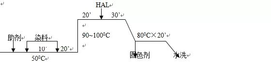 3)染色过程:50—600C始染—1000C保证——水先后固色处理。