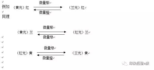 补色原理是配色中的一个别很重要的问题,在染浅色尤其是鲜艳色时,要尽量防止补色的产生而影响色光的纯正,因为在配色时,如引入主色外的补色,即产生灰色,拼出来的色必须灰暗无光。例如:(兰光) 微量橙 (黄光)红,而不直接加黄,因为兰与黄色互为补色,而成灰色,使色光发暗。在染深色时,常有意引入一些补色成分来配色,以增加色泽的深度,例如:在配制兰色时,常加入些红光紫,因红光紫中的红调是兰的补色,结果看上去色泽似乎深了些。