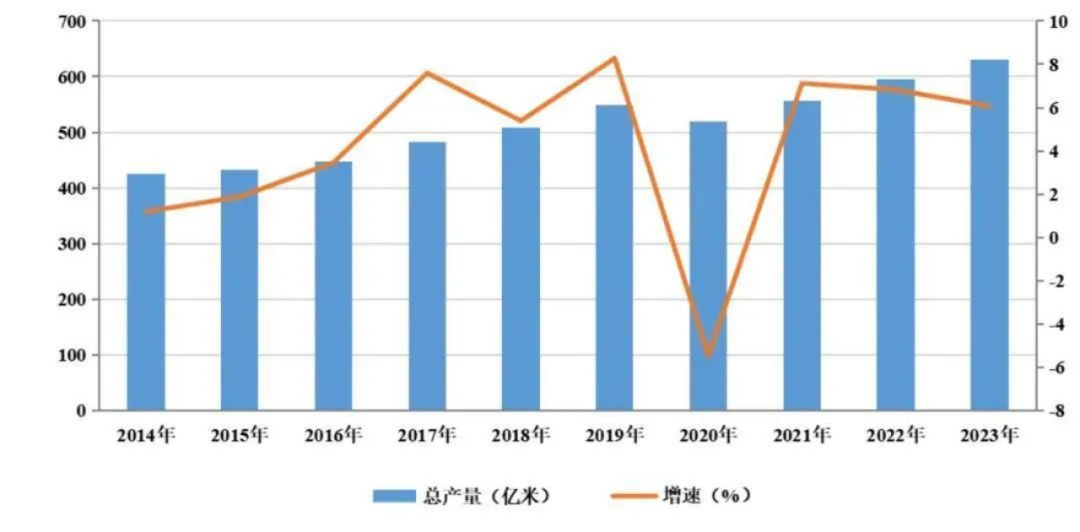 2023年全年我国化纤长丝织物总产量达到631亿米,同比增长6.05%。