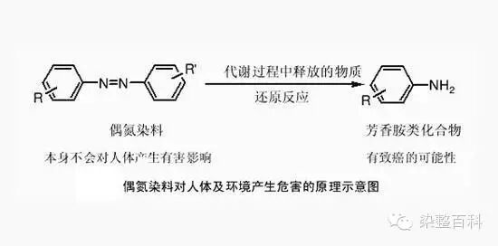 偶氮染料本事不具致癌性,当偶氮染料被还原分解成芳香胺中间体后,对人体才有致癌性。见下图: