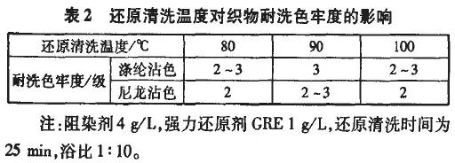 还原清洗必须在适当温度下进行。温度过低,清洗速率太慢,造成还原清洗不彻底;温度过高,则还原清洗效果不均匀。试验采用强力还原剂GRE,分别在不同温度条件下对涤纶纬弹织物进行还原清洗,结果见表2。