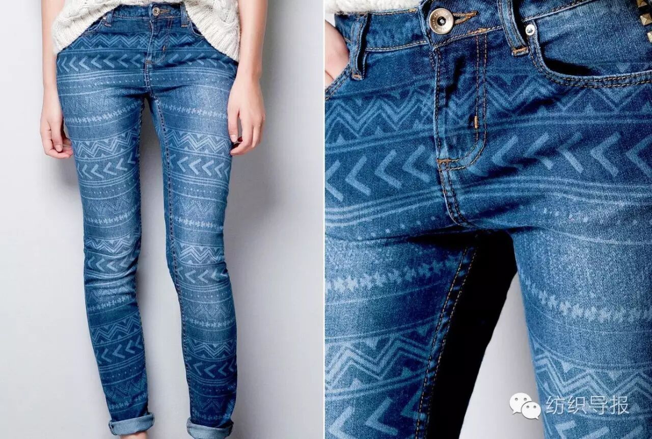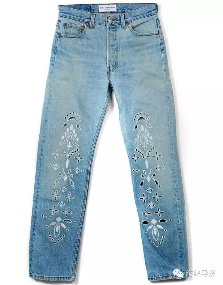 下图为快时尚品牌ZARA推出的激光雕花牛仔裤,该款型以传统马骝效果打底,然后创新性地加入了具有鲜明民族风格的几何矢量花纹,将激光雕花工艺擅长精细花纹加工的特点展现得淋漓尽致。