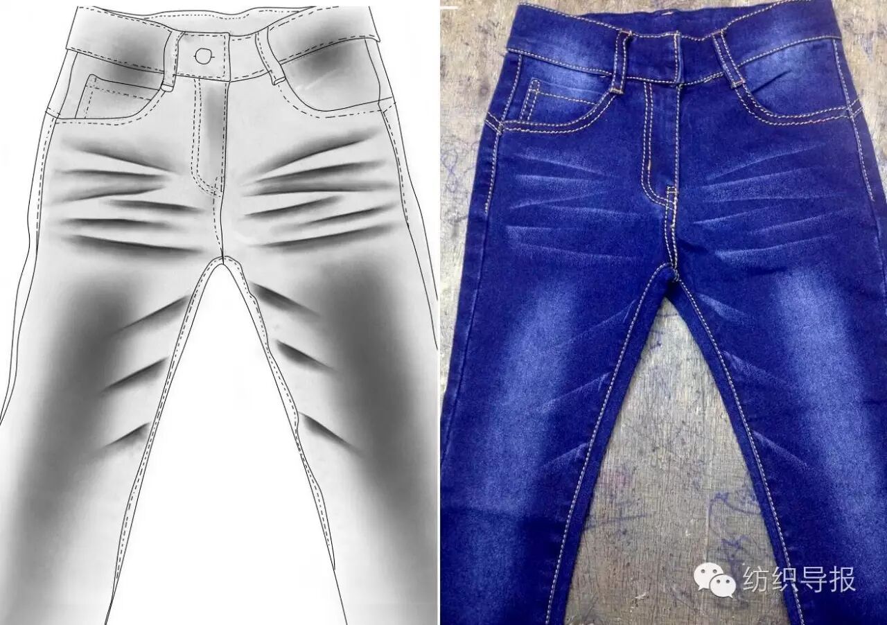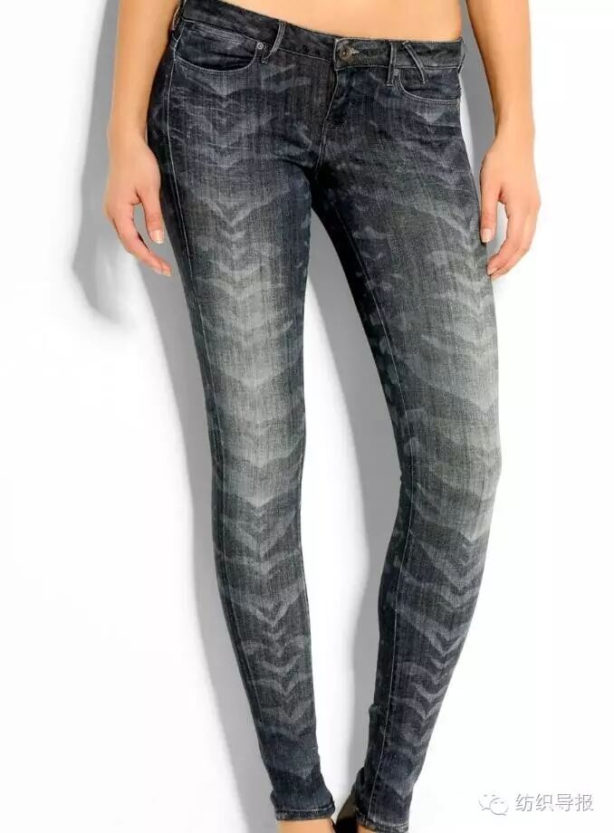 下图为GUESS品牌推出的个性化水洗牛仔裤,该款型在传统猫须、马骝水洗的基础上增加鱼鳞风格的激光雕花工艺,使之增添了几分神秘的时尚气息,激光雕花完美地呈现了鱼鳞图案层叠递进、自然过渡的效果。
