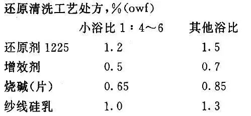 操作 室温下加增效剂、还原剂以及溶解好的碱液,搅拌5 min后,温度直升至80℃,保温20 min,放水冲洗干净,加纱线硅乳,再升温至40℃,保温15min,不冲洗,出缸。