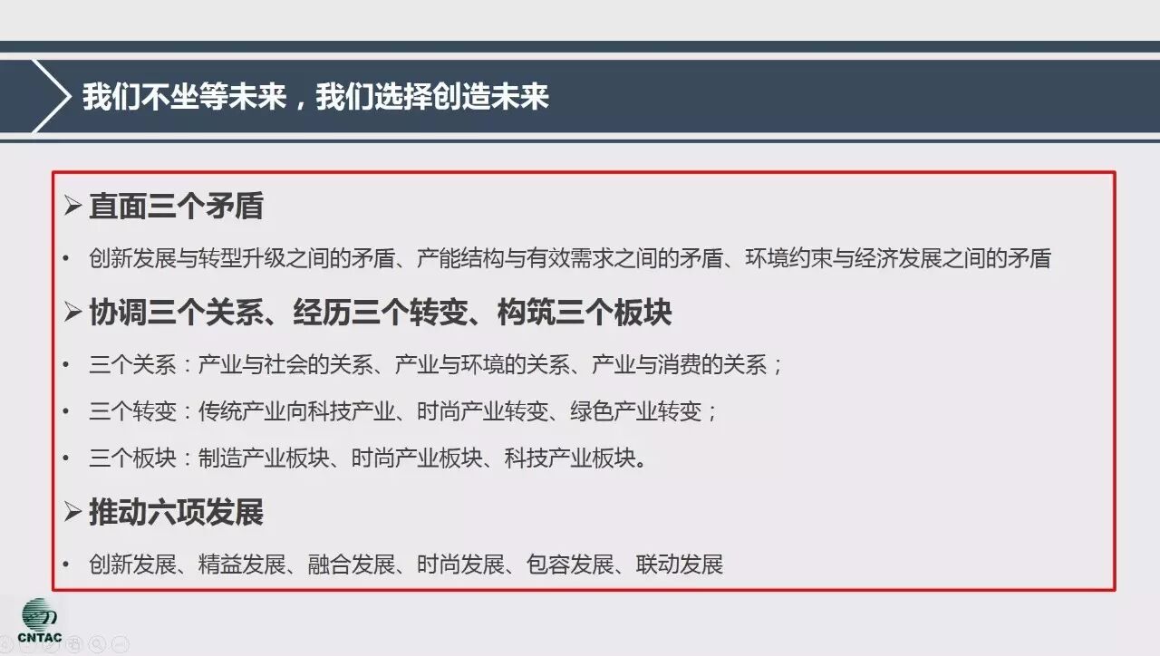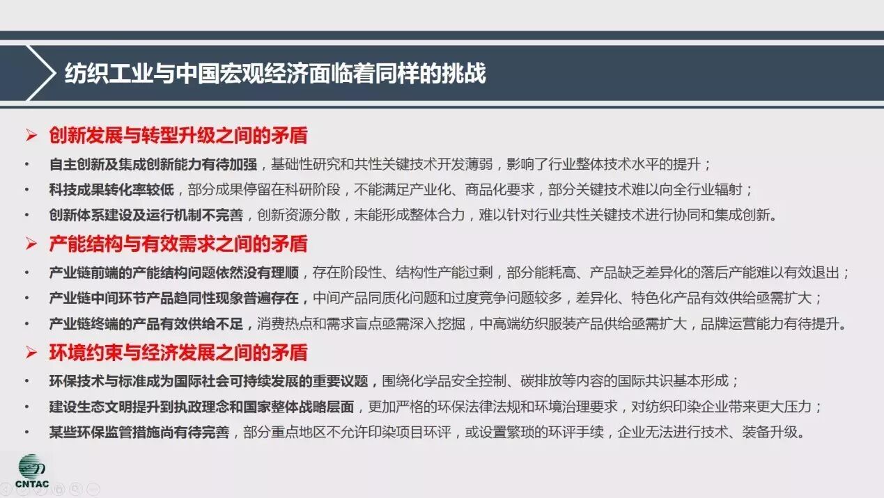 就目前来看,我国纺织工业面临一些现实的挑战,需要直面三个矛盾:一是创新发展与转型升级之间的矛盾,主要表现在自主创新与集成创新能力有待加强、科技成果转化率较低、创新体系建设及运行机制不完善等方面;二是产能结构与有效需求之间的矛盾,主要表现在产业链前端的产能结构问题仍然没有理顺、产业链中间环节产品趋同现象普遍存在、产业链终端的产品有效供给不足等方面;三是环境约束与经济发展之间的矛盾,主要表现在国际与国家战略层面的环保压力以及某些环保监管措施的不尽完善等方面。