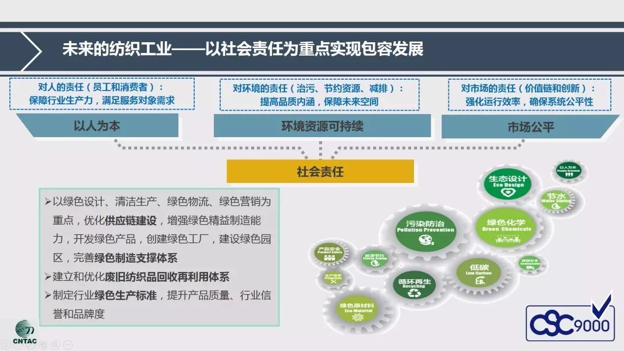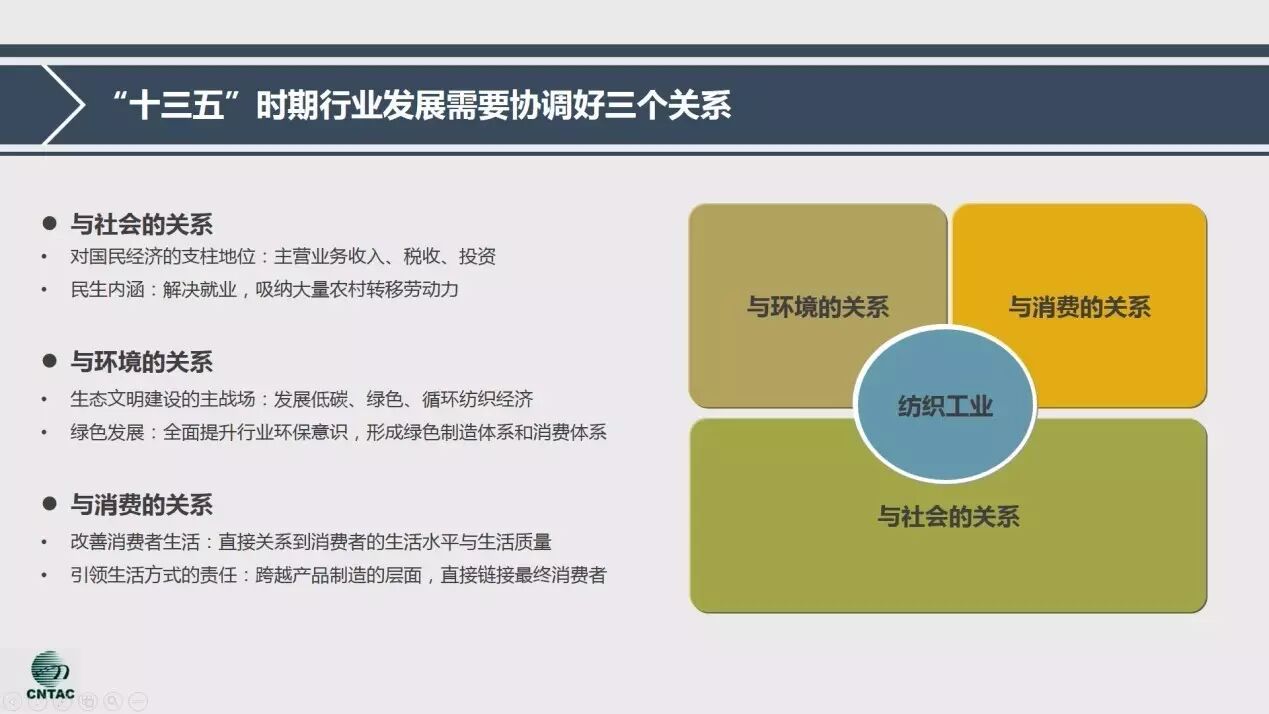 《纺织工业发展规划(2016—2020年)》提出了我国纺织工业的“三大定位、两大属性、六大作用”,即纺织工业是我国传统支柱产业、重要民生产业和创造国际化新优势的产业,是科技和时尚融合、生活消费与产业用并举的产业,在美化人民生活、增强文化自信、带动相关产业发展、拉动内需增长、促进社会和谐、建设生态文明等方面发挥着重要作用。因此,“十三五”时期纺织行业需根据前述矛盾和发展现状协调好三个关系——与社会的关系、与环境的关系、与消费的关系。