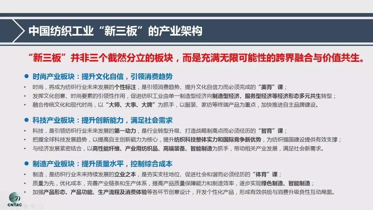 这3个板块并非截然独立,而是充满着无限可能的跨界融合与价值共生。时尚、科技、制造的融合发展才能实现行业的“美、智、体全面发展”。时尚,作为行业未来发展的个性标注,是引领消费趋势、提升文化自信而必须完成的“美育”课;科技,是引领行业未来发展的第一动力,是行业转型升级、打造战略制高点而必须经历的“智育”课;制造,是行业未来持续发展的立业之本,是夯实支柱地位、促进社会和谐而必须经历的“体育”课。
