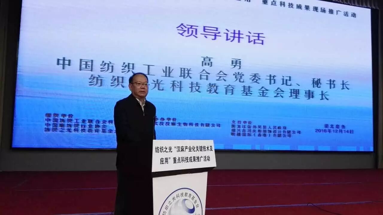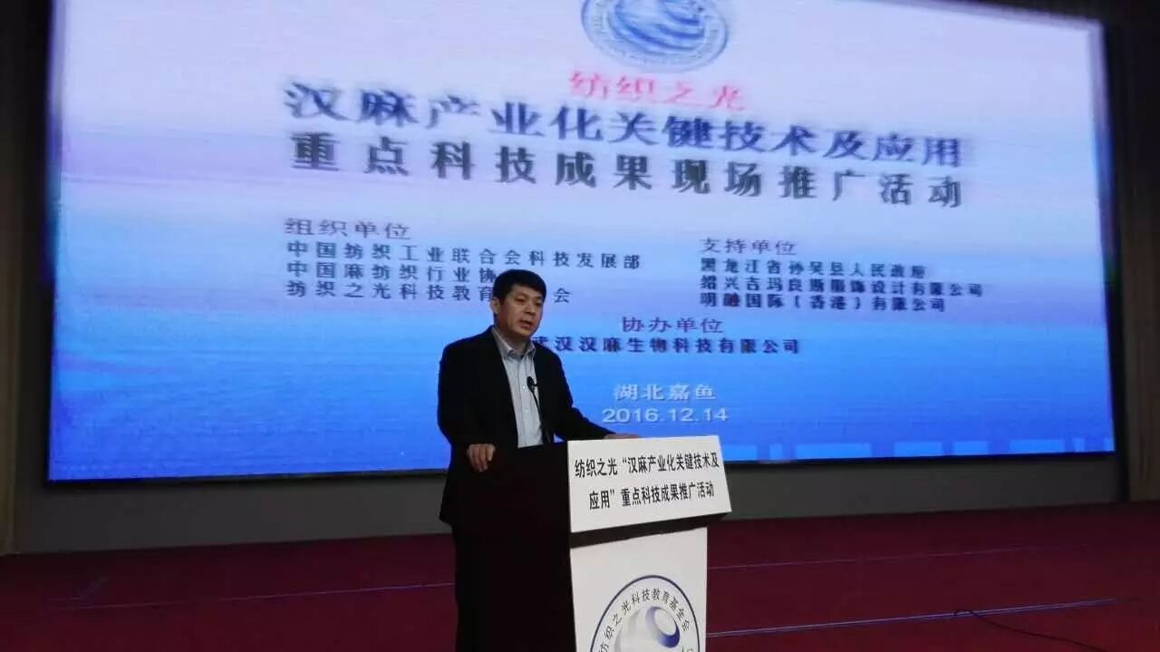 为了进一步推进国家创新驱动发展战略,进一步落实《建设纺织强国纲要(2011-2020)》和《纺织工业“十三五”科技进步纲要》,促进纺织行业科技成果转化,搭建行业新技术交流平台,12月14日,由中国纺织工业联合会科技发展部、中国麻纺织行业协会、纺织之光科技教育基金会主办,武汉汉麻生物科技有限公司协办,黑龙江孙吴县人民政府、绍兴吉马良斯服饰设计有限公司、明融国际(香港)有限公司支持的纺织之光“汉麻产业化关键技术及应用”重点科技成果现场推广活动在湖北嘉鱼举行。