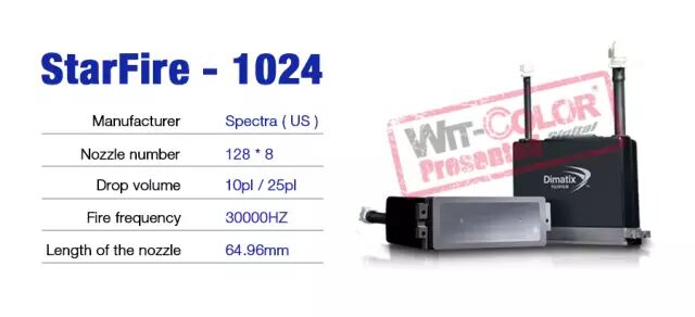 StarFire-1024是由美国 Fujifilm Dimatix 公司推出的一款新型工业级喷头,每一个星光1024喷头都拥有1024个独立控制的喷嘴通道,分8行平行排列在单片喷嘴面板上,而且所有1024个喷嘴既可以独立驱动喷墨,也可以同时驱动喷墨。
