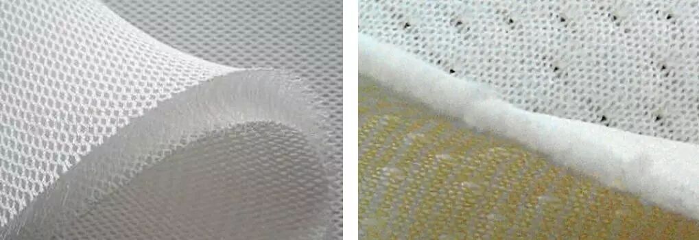 三维间隔织物分为经编间隔织物和纬编间隔织物,如图4所示。经编间隔织物可以由经编双针床机器编织,纬编间隔织物可以在纬编横机和圆机上织成。与普通二维织物不同,这种织物由上下两个表面层和中间一个间隔层组成。这种特殊的三维立体结构使得间隔层中的纤维呈空间曲折分布,具有无数微小孔隙的纤维三维网状结构,因此尘粒必须沿着滤材内间隔层的曲折网状路径进行过滤,随时都有可能与纤维发生碰撞而被截留,可以对尘粒进行拦截、惯性、扩散、筛滤等各种效应的表面和内部分离,有效拦截比滤材孔隙直径小的尘粒。间隔层的存在还可以提高流体的流动速度,加快过滤过程,具有阻力小、透气性能好等优点。但是也同样由于上述原因使得过滤不仅仅发生在滤材的表面,也在其内部孔隙之中发生,易造成滤材阻塞现象,使清灰工作难以进行,从而加大压力损失。但是相信随着纺织加工技术的进步,可以通过使用特种纤维或者特殊整理的方法改善三维间隔织物易阻塞和清灰困难的问题。