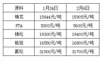 近日纱线市场行情上涨,2月8日,全棉纱32S普配报价22800元/吨,较昨日上涨20元/吨;全棉纱32S高配报价23730元/吨,较昨日上涨20元/吨;纯涤纱32S报价12900元/吨,较昨日上涨100元/吨;人棉纱30S报价21200元/吨,较昨日上涨50元/吨。