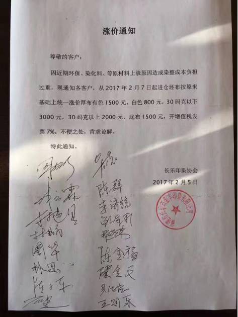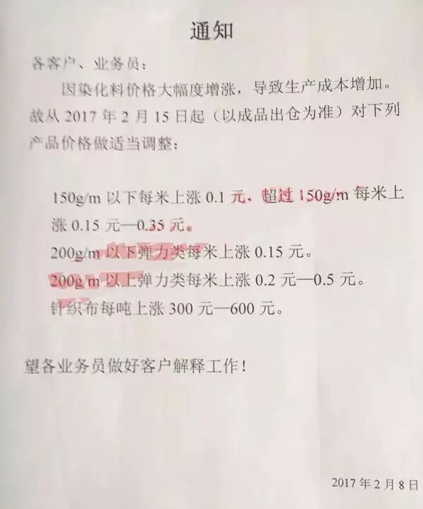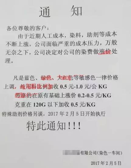 从通知单上面来看,涨价的原因来自近期人工成本,染料,助剂等成本的不断上涨,对于印染企业面临着严重的成本压力,万般无奈之下,公司决定对公司的染费做涨价处理!凡是蓝色,绿色,大红色等敏感色,一律价格上调,按用料比例加收0.5元-1元/KG,带涤的在原有基础上涨价0.2-0.5元/KG,克重在120G以下加收0.5元/KG。