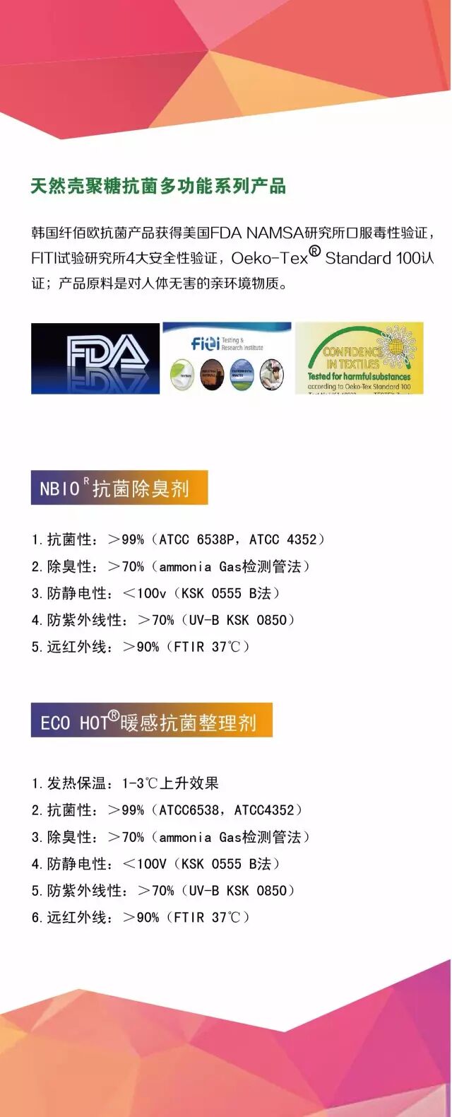 据悉,韩国纤佰欧在天然壳聚糖抗菌多功能系列的研究上做了不少探索,例如除虫菊、辣椒素(辣椒籽)具有杀菌作用的提取物,通过浸泡(浸轧)和焙烘的加工方法赋予被褥、枕头、毛毯、床垫等家纺用品抗菌、除臭、防螨等作用。