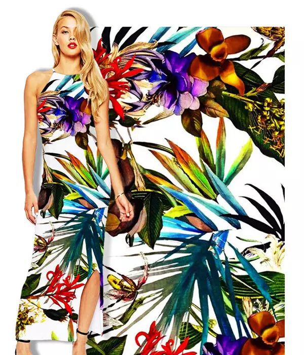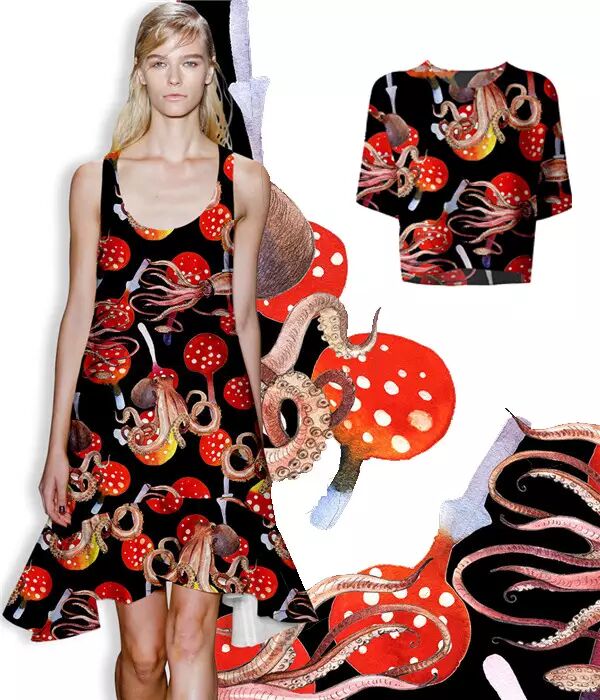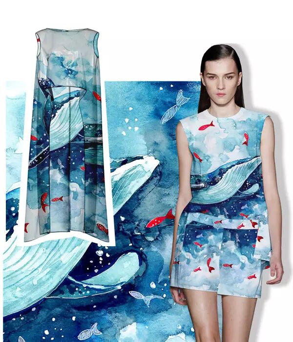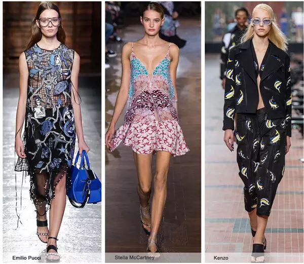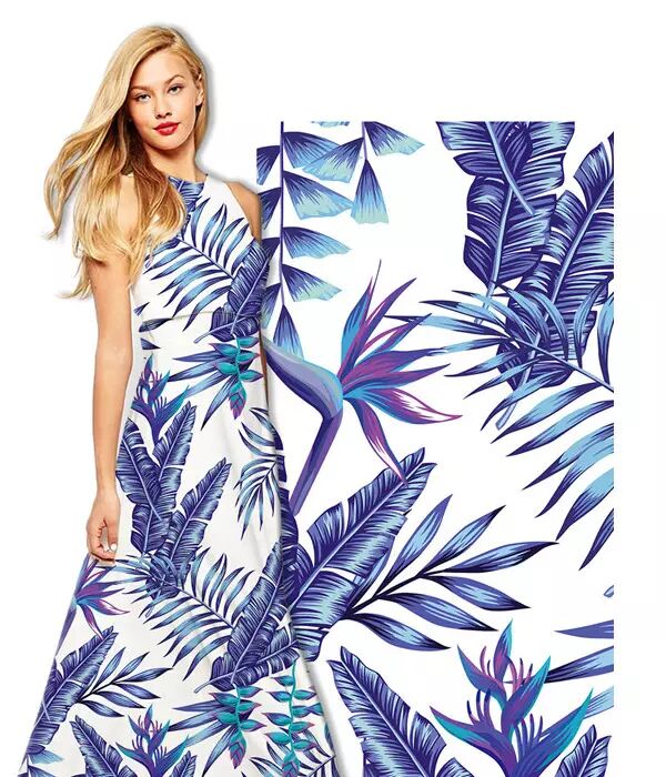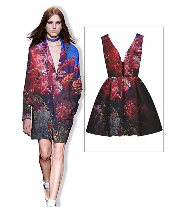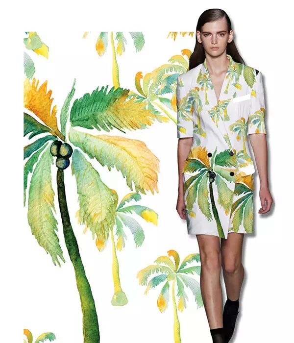 2017春夏,绚丽夺目的热带印花再次成功吸引住人们的眼球,同时展现了夏日的明媚和活力。大尺寸的植物叶片和明亮色彩是关键设计,夸张的绿叶层层叠叠,微型昆虫或栖息或攀爬,一派生机盎然的气象,营造度假感。