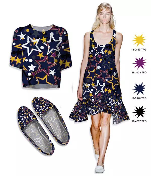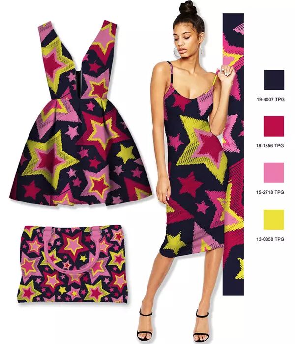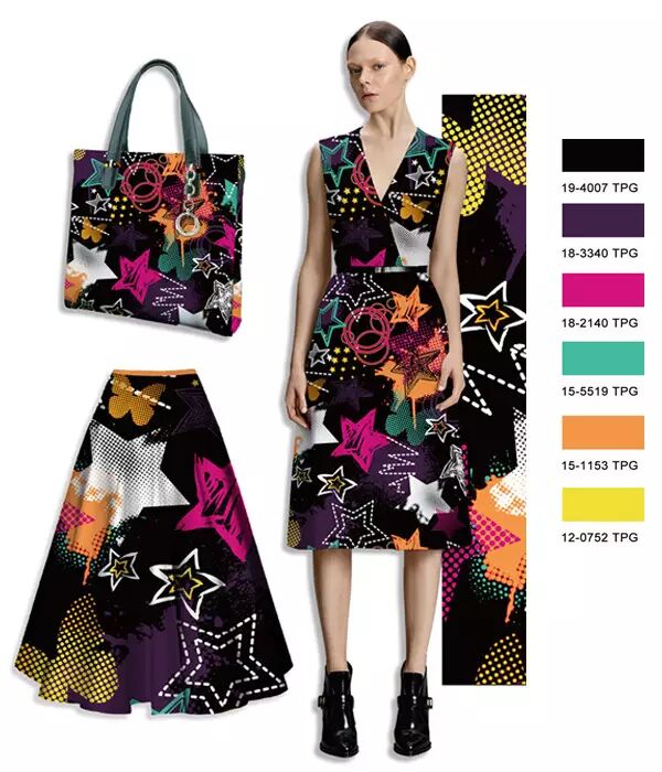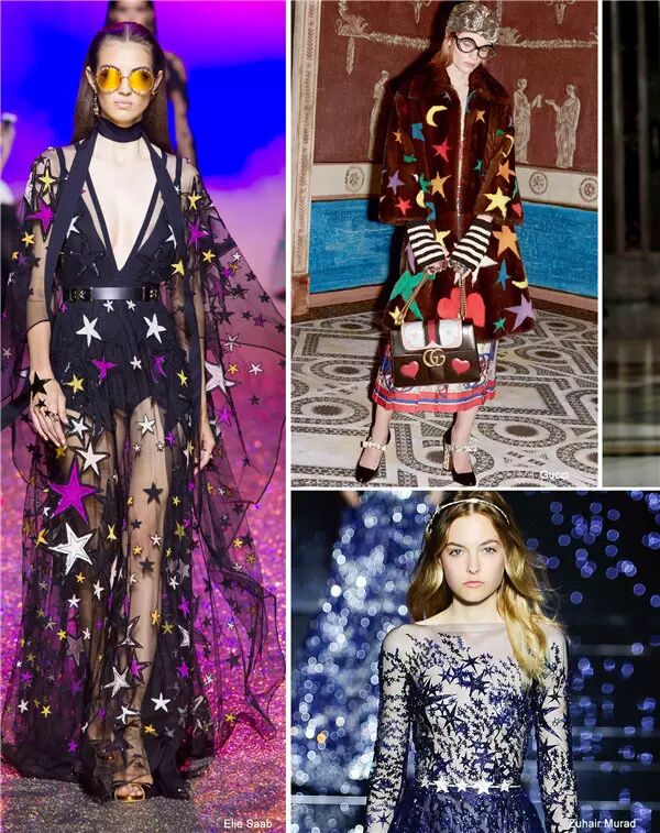 设计师巧妙运用各种手法,将星星元素玩出新意和时髦感。将星星和圆点、水果、爱心、蝴蝶、字母、经典红唇等趣味元素放在一起,随意或规则,打造丰富的视觉外观。