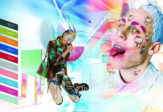 色彩:一系列强烈冲突而网络化的色彩。高彩度的电子蓝色和橙色和酸绿色,玫粉色与红色的结合与撞色,具有直白而个性的表达及警示作用;视幻和滤镜化的灰色,沙粉色,泡沫蓝,青绿色,如同自拍软件中的清新而复古的色调。