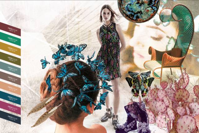 人们对于自然及动植物的探索不断深入,崇尚原生态的生活态度,部落文化和现代时尚的融汇,如同都市中流浪的艺术家,独具活力风情和浪漫魅力。全球化趋势和即看即买策略使得季节性不再明显,环球旅行和波西米亚多元化游牧风格持续风靡,以更加艺术化形式满足全球人类诉求。 色彩:全球自然世界的丰富色彩,一系列低彩度的色彩展现原生态美学和艺术化质感。暗调沙漠色和赤褐色搭配一系列的大地色系,包括灰调军绿色,丛林绿色,灰蓝色和摩卡色,搭配艺术化的蓝青色和紫罗兰色,共同演绎自然的浪漫主义情怀。